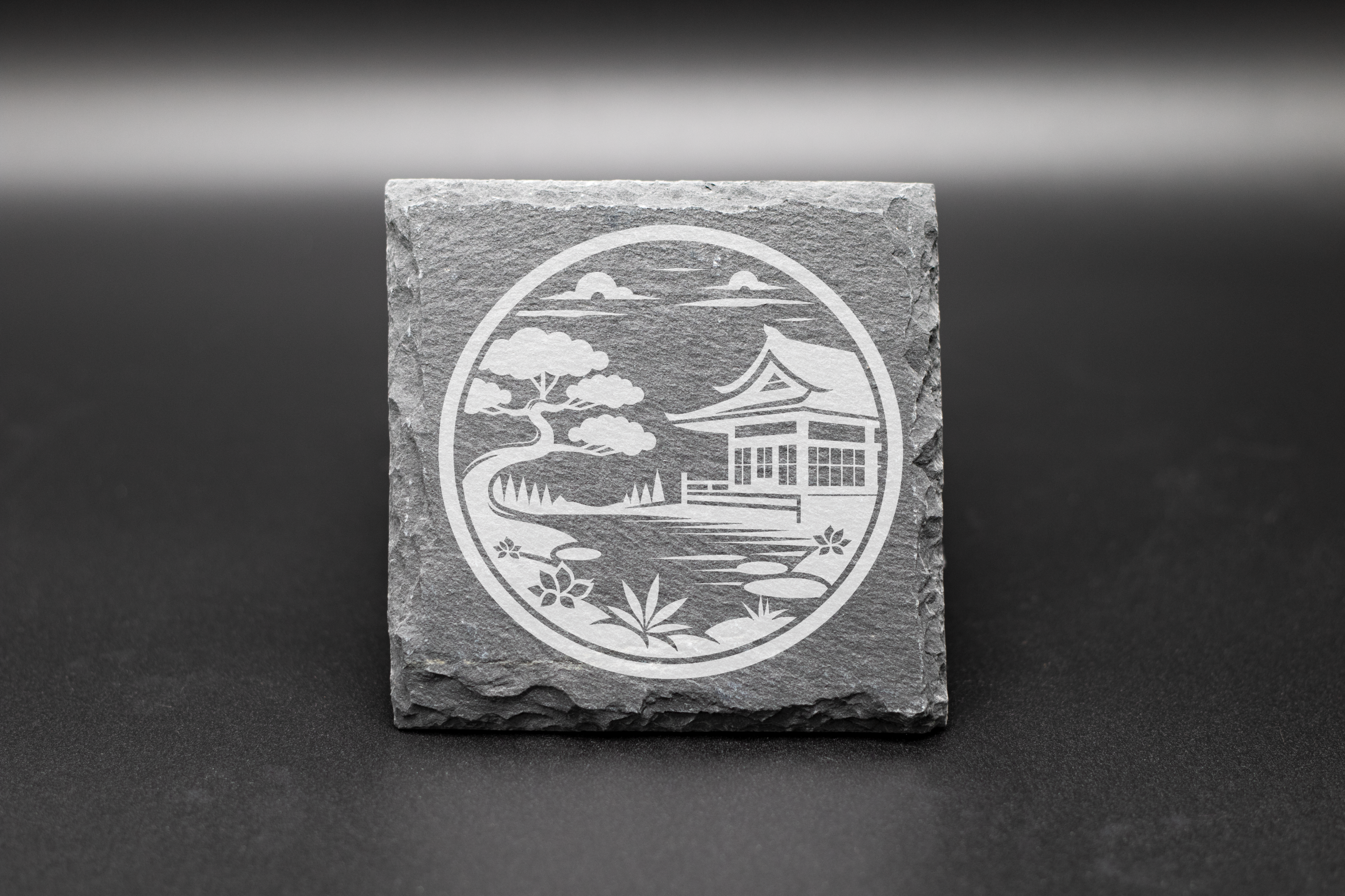 Slate coaster with engraving, here featuring a Japanese garden. Size 10cm x 10cm with 4 fabric feet.
