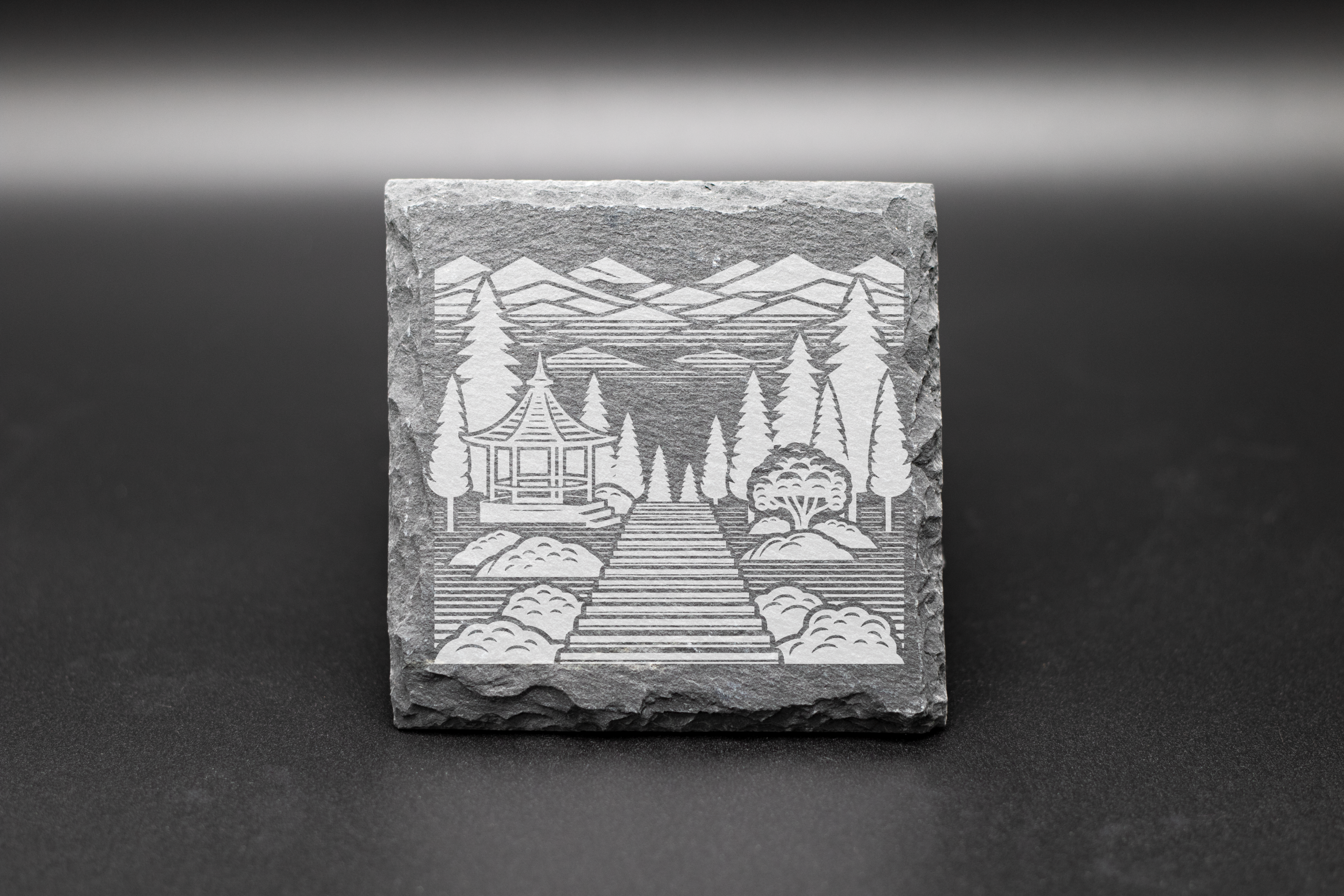 Engraved slate coaster, shown here with Japanese nature motif. Size 10 cm x 10 cm with 4 fabric feet.
